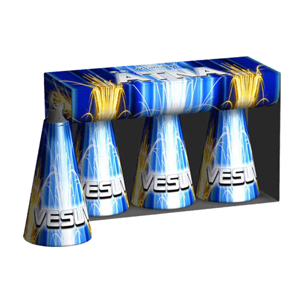 3 Effektvulkane mit hoch sprühenden Gold- und Silbersternen in einer Blisterschachtel.