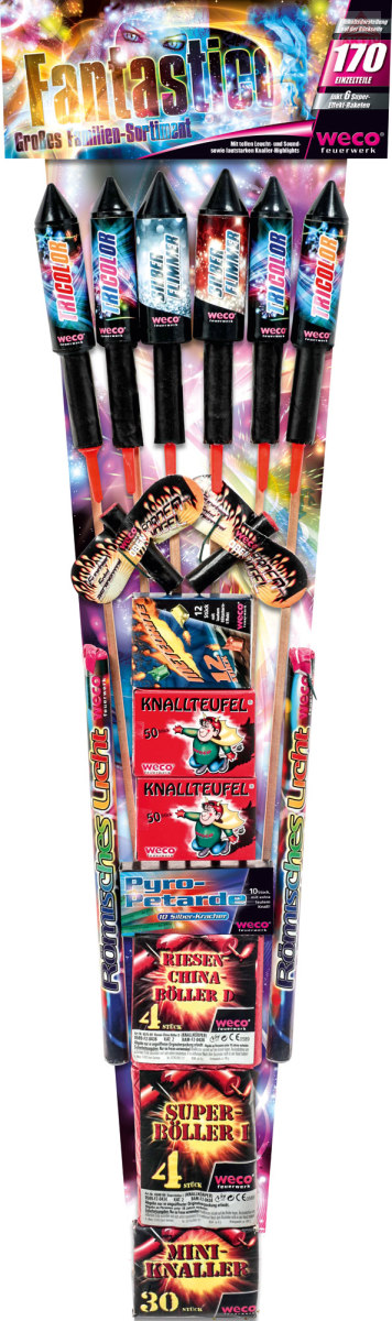 Großes WECO Familien-Sortiment 170 tlg, inkl. 6 Effekt Raketen. Perfektes Aktionssortiment mit tollen Leucht- und Sound sowie lautstarken Knaller Highlights.